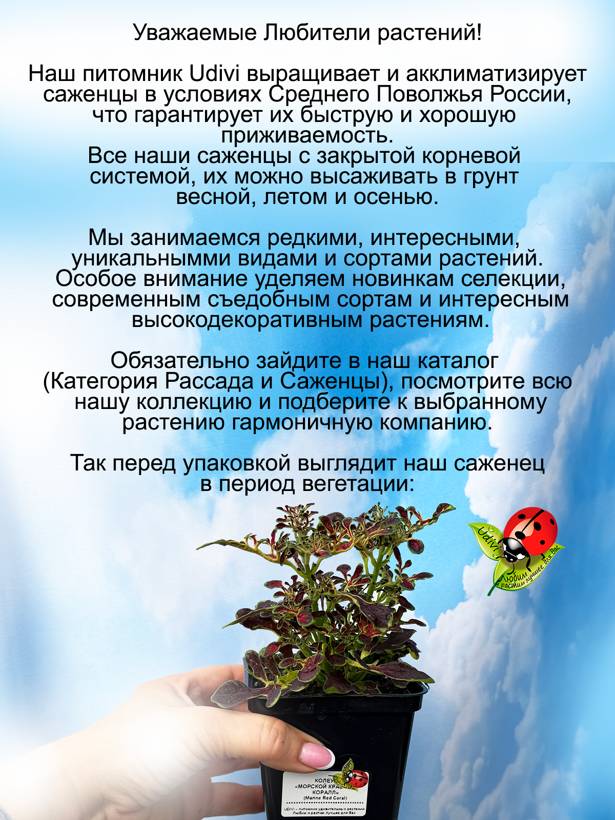 Внимание! Подробное описание конкретного растения, его название и характеристики смотрите на фотографиях карточки. Здесь ниже только общее описание выращиваемых нами растений. Всю информацию о нужном вам саженце читайте на фотографиях товара. Саженцы живых растений седумов и молодил - универсальное украшение вашего сада, которое все больше набирает популярность в ландшафтном дизайне. Рассада домашних цветов прекрасно приживается, это многолетнее растение, которое можно использовать и как цветы в горшках, и как уличные растения. Эти неприхотливые садовые цветы, создадут на даче и в саду в любое время года зеленый фон. Многолетники саженцы предназначены для открытого грунта, не сложные в уходе, поскольку они неукрывные, морозостойкие, зимостойкие, зимующие как в южных регионах, так и в средней полосе. Многие виды саженцев подходят и как почвопокровники и как ампельные растения, прекрасно борятся с сорняками – разрастаясь густым ковром, они вытесняют сорняки, а также устойчивы к вытаптыванию. Также мы разводим такие съедобные растения как малина жимолость ежевика актинидия ежемалина виноград брусника голубика годжи ягода молодости айва ревень земляника княженика современных сортов новейшей селекции. Также у нас есть маточники и мы размножаем вербейник лизимахия армерия, нам нравится клематис живучка, которая также в наших фаворитах коллизия и спирея, кроме того будра и традесканция неприхотливые ясколка лаванда и обриета восхитительно цветут и радуют глаз. Синеголовник очиток и мшанка красивы в любое время как и камнеломка, но есть в нашем хозяйстве и гипсофила роза алиссум крестовник, а гвоздика и оттона радуют нас вместе с арабисом как и шалфей. Гейхера и гортензия это фейерверк красок, множество сортов полыни и аптения вариегатная радуют глаз. Простая палитра – это клевер и горец. Очень любим пряные травы редких сортов чабрец тимьян красивая душица восхитительно смотрится на фоне мяты и орегано. Мы имеем злаков огромную коллекцию вейник и осока новых сортов