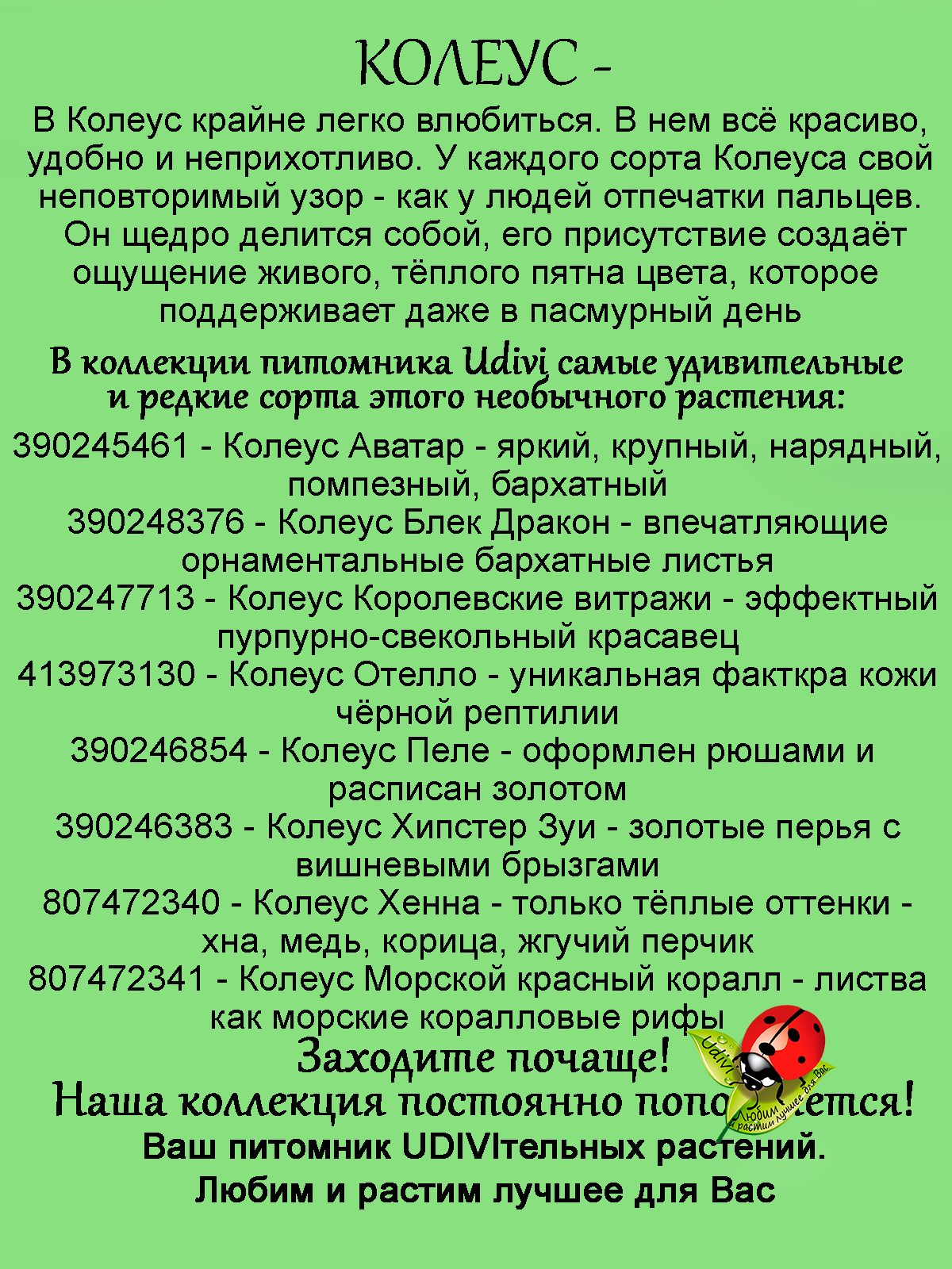 Внимание! Подробное описание конкретного товара, его название и характеристики смотрите на фотографиях карточки. Здесь ниже только общее описание выращиваемых нами растений. Всю информацию о нужном вам товаре читайте на фотографиях товара. Саженцы живых растений плодовых, декоративных цветов, седумов и молодил - универсальное украшение вашего сада, которое все больше набирает популярность в ландшафтном дизайне. Рассада домашних цветов прекрасно приживается, это многолетнее растение, которое можно использовать как цветы в горшках, и как уличное растение. Эти неприхотливые садовые цветы, создадут на даче и в саду в любое время года зеленый фон. Многолетники предназначены для открытого грунта, поскольку они не укрывные, морозостойкие, зимостойкие, зимующие как в южных регионах, так и в средней полосе. Многие виды саженцев подходят и как почвопокровники и как ампельные растения, прекрасно борятся с сорняками, разрастаясь густым ковром, они вытесняют сорняки, а также устойчивы к вытаптыванию. Также разводим такие съедобные растения как малина жимолость ежевика актинидия ежемалина виноград брусника голубика годжи ягода молодости айва ревень земляника княженика современных сортов новейшей селекции. Также у нас есть маточники и мы размножаем вербейник лизимахия армерия, нам нравится клематис живучка, которая также в наших фаворитах коллизия и спирея, кроме того будра и традесканция неприхотливые ясколка лаванда и обриета восхитительно цветут и радуют глаз. Синеголовник очиток и мшанка очень красивы в любое время как и камнеломка, но есть в нашем хозяйстве и гипсофила роза алиссум крестовник, а гвоздика и оттона радуют нас вместе с арабисом, как и шалфей. Гейхера и гортензия это фейерверк красок, множество сортов полыни и аптения вариегатная радуют глаз. Простая палитра – это клевер и горец. Очень любим пряные травы редких сортов чабрец тимьян красивая душица восхитительно смотрится на фоне мяты и орегано. Мы имеем огромную коллекцию злаков вейник и прекрасная осока.