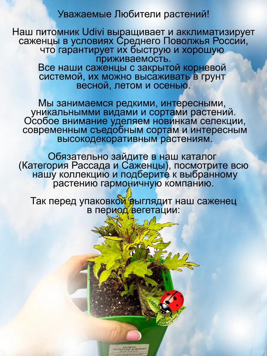 Внимание! Подробное описание конкретного растения, его название и характеристики смотрите на фотографиях карточки. Здесь ниже только общее описание выращиваемых нами растений. Всю информацию о нужном вам саженце читайте на фотографиях товара. Саженцы живых растений седумов и молодил - универсальное украшение вашего сада, которое все больше набирает популярность в ландшафтном дизайне. Рассада домашних цветов прекрасно приживается, это многолетнее растение, которое можно использовать и как цветы в горшках, и как уличные растения. Эти неприхотливые садовые цветы, создадут на даче и в саду в любое время года зеленый фон. Многолетники саженцы предназначены для открытого грунта, не сложные в уходе, поскольку они неукрывные, морозостойкие, зимостойкие, зимующие как в южных регионах, так и в средней полосе. Многие виды саженцев подходят и как почвопокровники и как ампельные растения, прекрасно борятся с сорняками – разрастаясь густым ковром, они вытесняют сорняки, а также устойчивы к вытаптыванию. Также мы разводим такие съедобные растения как малина жимолость ежевика актинидия ежемалина виноград брусника голубика годжи ягода молодости айва ревень земляника княженика современных сортов новейшей селекции. Также у нас есть маточники и мы размножаем вербейник лизимахия армерия, нам нравится клематис живучка, которая также в наших фаворитах коллизия и спирея, кроме того будра и традесканция неприхотливые ясколка лаванда и обриета восхитительно цветут и радуют глаз. Синеголовник очиток и мшанка красивы в любое время как и камнеломка, но есть в нашем хозяйстве и гипсофила роза алиссум крестовник, а гвоздика и оттона радуют нас вместе с арабисом как и шалфей. Гейхера и гортензия это фейерверк красок, множество сортов полыни и аптения вариегатная радуют глаз. Простая палитра – это клевер и горец. Очень любим пряные травы редких сортов чабрец тимьян красивая душица восхитительно смотрится на фоне мяты и орегано. Мы имеем злаков огромную коллекцию вейник и осока новых сортов