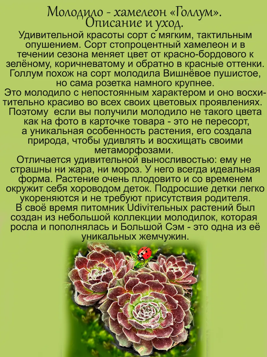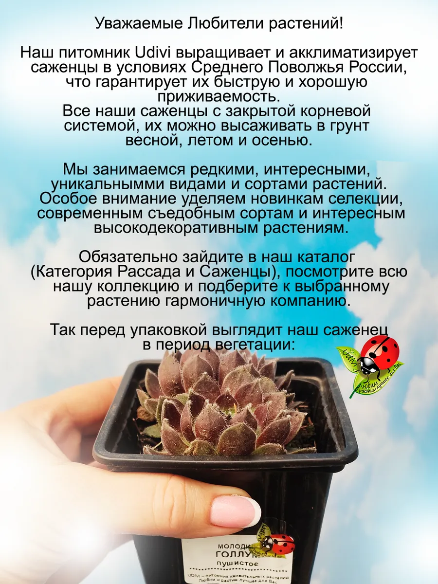 Внимание! Подробное описание конкретного растения, его название и характеристики смотрите на фотографиях карточки. Здесь ниже только общее описание выращиваемых нами растений. Всю информацию о нужном вам саженце читайте на фотографиях товара. Саженцы живых растений седумов и молодил - универсальное украшение вашего сада, которое все больше набирает популярность в ландшафтном дизайне. Рассада домашних цветов прекрасно приживается, это многолетнее растение, которое можно использовать и как цветы в горшках, и как уличные растения. Эти неприхотливые садовые цветы, создадут на даче и в саду в любое время года зеленый фон. Многолетники саженцы предназначены для открытого грунта, не сложные в уходе, поскольку они неукрывные, морозостойкие, зимостойкие, зимующие как в южных регионах, так и в средней полосе. Многие виды саженцев подходят и как почвопокровники и как ампельные растения, прекрасно борятся с сорняками – разрастаясь густым ковром, они вытесняют сорняки, а также устойчивы к вытаптыванию. Также мы разводим такие съедобные растения как малина жимолость ежевика актинидия ежемалина виноград брусника голубика годжи ягода молодости айва ревень земляника княженика современных сортов новейшей селекции. Также у нас есть маточники и мы размножаем вербейник лизимахия армерия, нам нравится клематис живучка, которая также в наших фаворитах коллизия и спирея, кроме того будра и традесканция неприхотливые ясколка лаванда и обриета восхитительно цветут и радуют глаз. Синеголовник очиток и мшанка красивы в любое время как и камнеломка, но есть в нашем хозяйстве и гипсофила роза алиссум крестовник, а гвоздика и оттона радуют нас вместе с арабисом как и шалфей. Гейхера и гортензия это фейерверк красок, множество сортов полыни и аптения вариегатная радуют глаз. Простая палитра – это клевер и горец. Очень любим пряные травы редких сортов чабрец тимьян красивая душица восхитительно смотрится на фоне мяты и орегано. Мы имеем злаков огромную коллекцию вейник и осока новых сортов