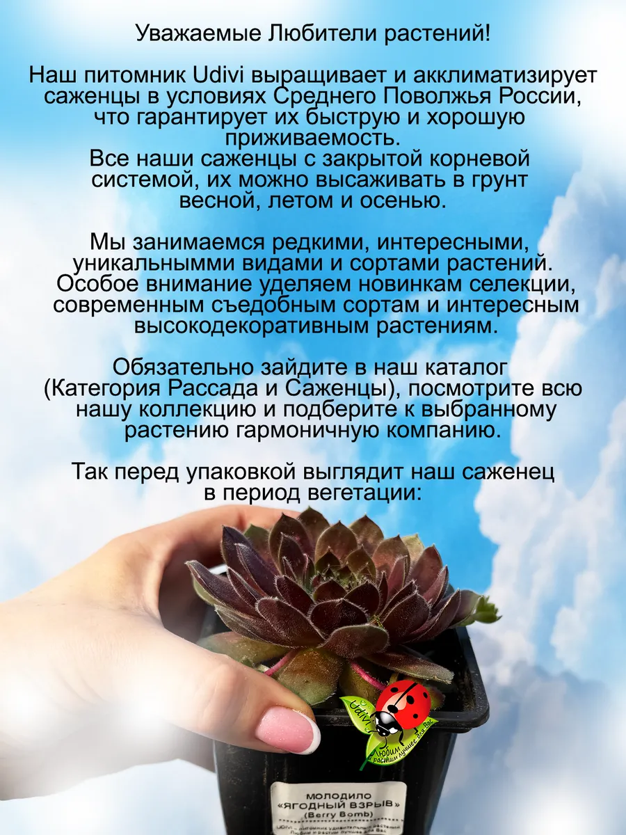 Внимание! Подробное описание конкретного растения, его название и характеристики смотрите на фотографиях карточки. Здесь ниже только общее описание выращиваемых нами растений. Всю информацию о нужном вам саженце читайте на фотографиях товара. Саженцы живых растений седумов и молодил - универсальное украшение вашего сада, которое все больше набирает популярность в ландшафтном дизайне. Рассада домашних цветов прекрасно приживается, это многолетнее растение, которое можно использовать и как цветы в горшках, и как уличные растения. Эти неприхотливые садовые цветы, создадут на даче и в саду в любое время года зеленый фон. Многолетники саженцы предназначены для открытого грунта, не сложные в уходе, поскольку они неукрывные, морозостойкие, зимостойкие, зимующие как в южных регионах, так и в средней полосе. Многие виды саженцев подходят и как почвопокровники и как ампельные растения, прекрасно борятся с сорняками – разрастаясь густым ковром, они вытесняют сорняки, а также устойчивы к вытаптыванию. Также мы разводим такие съедобные растения как малина жимолость ежевика актинидия ежемалина виноград брусника голубика годжи ягода молодости айва ревень земляника княженика современных сортов новейшей селекции. Также у нас есть маточники и мы размножаем вербейник лизимахия армерия, нам нравится клематис живучка, которая также в наших фаворитах коллизия и спирея, кроме того будра и традесканция неприхотливые ясколка лаванда и обриета восхитительно цветут и радуют глаз. Синеголовник очиток и мшанка красивы в любое время как и камнеломка, но есть в нашем хозяйстве и гипсофила роза алиссум крестовник, а гвоздика и оттона радуют нас вместе с арабисом как и шалфей. Гейхера и гортензия это фейерверк красок, множество сортов полыни и аптения вариегатная радуют глаз. Простая палитра – это клевер и горец. Очень любим пряные травы редких сортов чабрец тимьян красивая душица восхитительно смотрится на фоне мяты и орегано. Мы имеем злаков огромную коллекцию вейник и осока новых сортов