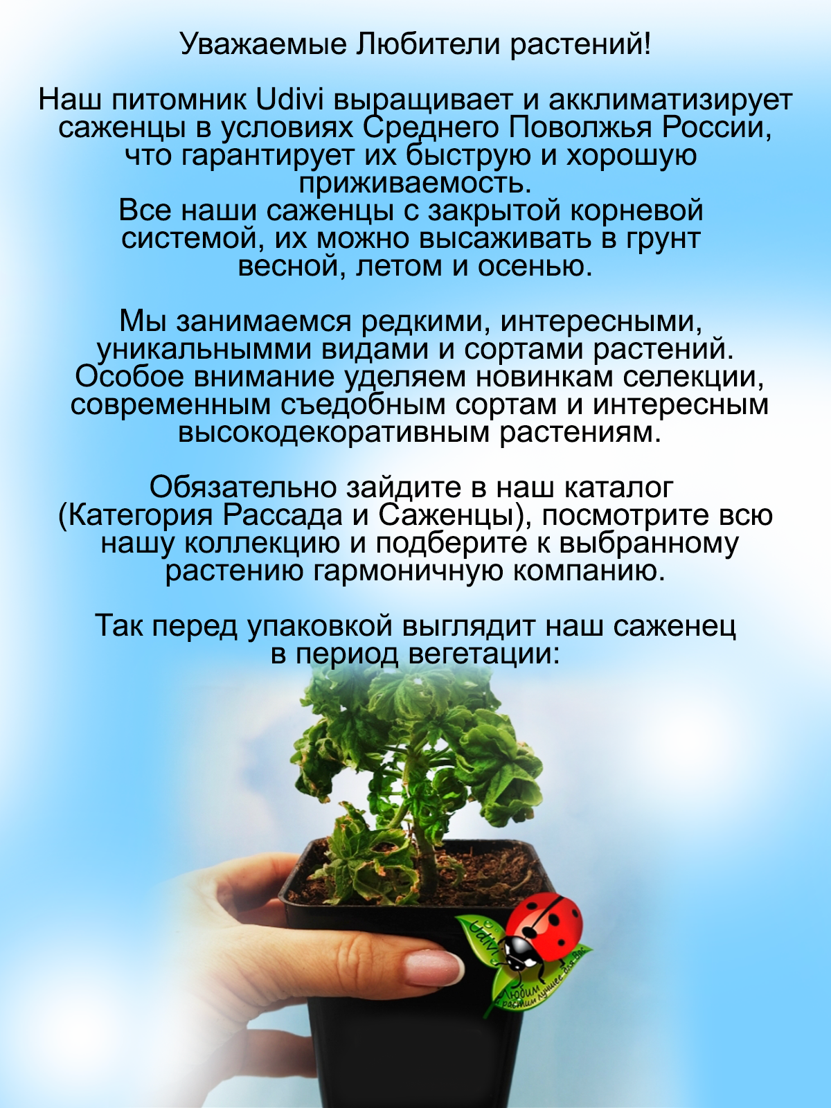 Внимание! Подробное описание конкретного растения, его название и характеристики смотрите на фотографиях карточки. Здесь ниже только общее описание выращиваемых нами растений. Всю информацию о нужном вам саженце читайте на фотографиях товара. Саженцы живых растений седумов и молодил - универсальное украшение вашего сада, которое все больше набирает популярность в ландшафтном дизайне. Рассада домашних цветов прекрасно приживается, это многолетнее растение, которое можно использовать и как цветы в горшках, и как уличные растения. Эти неприхотливые садовые цветы, создадут на даче и в саду в любое время года зеленый фон. Многолетники саженцы предназначены для открытого грунта, не сложные в уходе, поскольку они неукрывные, морозостойкие, зимостойкие, зимующие как в южных регионах, так и в средней полосе. Многие виды саженцев подходят и как почвопокровники и как ампельные растения, прекрасно борятся с сорняками – разрастаясь густым ковром, они вытесняют сорняки, а также устойчивы к вытаптыванию. Также мы разводим такие съедобные растения как малина жимолость ежевика актинидия ежемалина виноград брусника голубика годжи ягода молодости айва ревень земляника княженика современных сортов новейшей селекции. Также у нас есть маточники и мы размножаем вербейник лизимахия армерия, нам нравится клематис живучка, которая также в наших фаворитах коллизия и спирея, кроме того будра и традесканция неприхотливые ясколка лаванда и обриета восхитительно цветут и радуют глаз. Синеголовник очиток и мшанка красивы в любое время как и камнеломка, но есть в нашем хозяйстве и гипсофила роза алиссум крестовник, а гвоздика и оттона радуют нас вместе с арабисом как и шалфей. Гейхера и гортензия это фейерверк красок, множество сортов полыни и аптения вариегатная радуют глаз. Простая палитра – это клевер и горец. Очень любим пряные травы редких сортов чабрец тимьян красивая душица восхитительно смотрится на фоне мяты и орегано. Мы имеем злаков огромную коллекцию вейник и осока новых сортов
