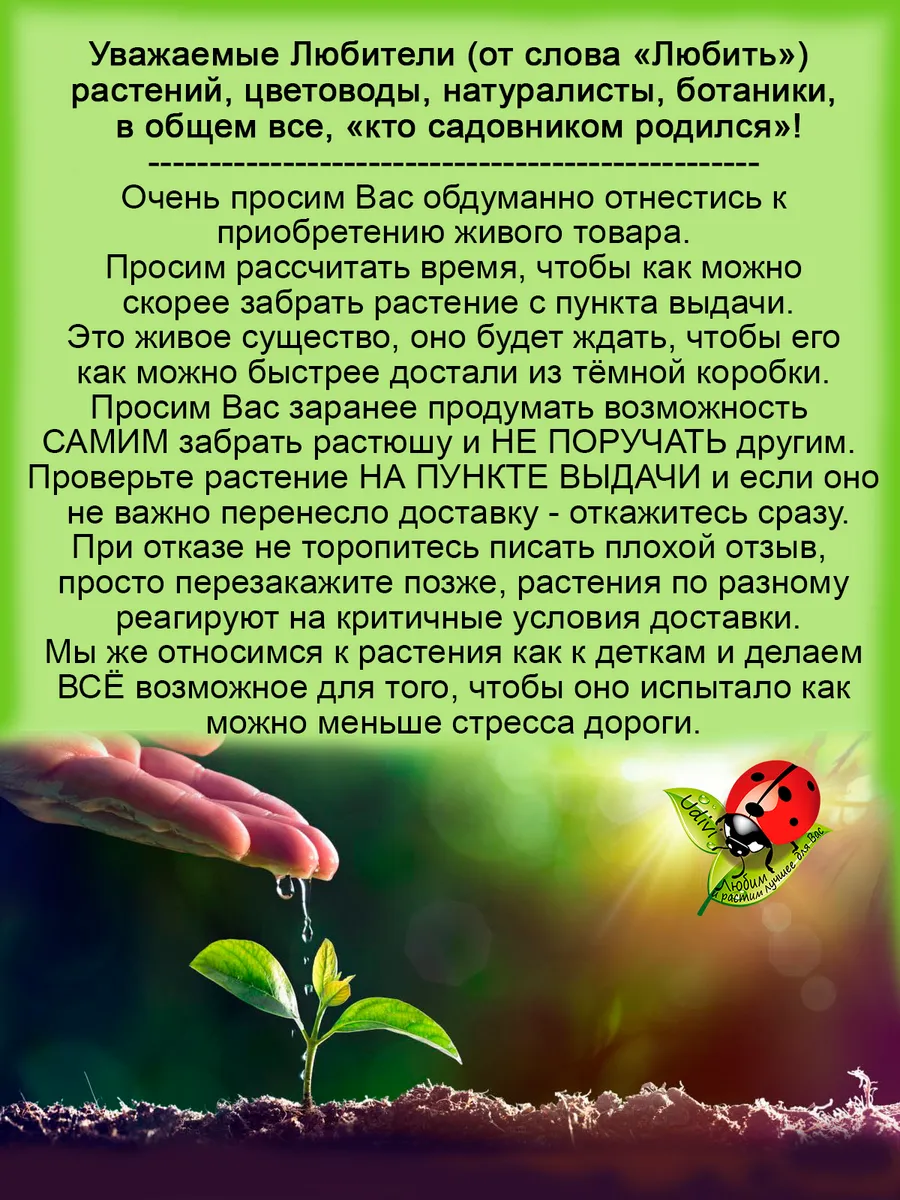 Внимание! Подробное описание конкретного растения, его название и характеристики смотрите на фотографиях карточки. Здесь ниже только общее описание выращиваемых нами растений. Всю информацию о нужном вам саженце читайте на фотографиях товара. Саженцы живых растений седумов и молодил - универсальное украшение вашего сада, которое все больше набирает популярность в ландшафтном дизайне. Рассада домашних цветов прекрасно приживается, это многолетнее растение, которое можно использовать и как цветы в горшках, и как уличные растения. Эти неприхотливые садовые цветы, создадут на даче и в саду в любое время года зеленый фон. Многолетники саженцы предназначены для открытого грунта, не сложные в уходе, поскольку они неукрывные, морозостойкие, зимостойкие, зимующие как в южных регионах, так и в средней полосе. Многие виды саженцев подходят и как почвопокровники и как ампельные растения, прекрасно борятся с сорняками – разрастаясь густым ковром, они вытесняют сорняки, а также устойчивы к вытаптыванию. Также мы разводим такие съедобные растения как малина жимолость ежевика актинидия ежемалина виноград брусника голубика годжи ягода молодости айва ревень земляника княженика современных сортов новейшей селекции. Также у нас есть маточники и мы размножаем вербейник лизимахия армерия, нам нравится клематис живучка, которая также в наших фаворитах коллизия и спирея, кроме того будра и традесканция неприхотливые ясколка лаванда и обриета восхитительно цветут и радуют глаз. Синеголовник очиток и мшанка красивы в любое время как и камнеломка, но есть в нашем хозяйстве и гипсофила роза алиссум крестовник, а гвоздика и оттона радуют нас вместе с арабисом как и шалфей. Гейхера и гортензия это фейерверк красок, множество сортов полыни и аптения вариегатная радуют глаз. Простая палитра – это клевер и горец. Очень любим пряные травы редких сортов чабрец тимьян красивая душица восхитительно смотрится на фоне мяты и орегано. Мы имеем злаков огромную коллекцию вейник и осока новых сортов