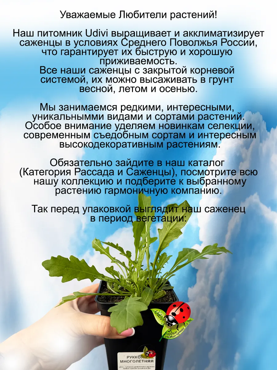 Внимание! Подробное описание конкретного растения, его название и характеристики смотрите на фотографиях карточки. Здесь ниже только общее описание выращиваемых нами растений. Всю информацию о нужном вам саженце читайте на фотографиях товара. Саженцы живых растений седумов и молодил - универсальное украшение вашего сада, которое все больше набирает популярность в ландшафтном дизайне. Рассада домашних цветов прекрасно приживается, это многолетнее растение, которое можно использовать и как цветы в горшках, и как уличные растения. Эти неприхотливые садовые цветы, создадут на даче и в саду в любое время года зеленый фон. Многолетники саженцы предназначены для открытого грунта, не сложные в уходе, поскольку они неукрывные, морозостойкие, зимостойкие, зимующие как в южных регионах, так и в средней полосе. Многие виды саженцев подходят и как почвопокровники и как ампельные растения, прекрасно борятся с сорняками – разрастаясь густым ковром, они вытесняют сорняки, а также устойчивы к вытаптыванию. Также мы разводим такие съедобные растения как малина жимолость ежевика актинидия ежемалина виноград брусника голубика годжи ягода молодости айва ревень земляника княженика современных сортов новейшей селекции. Также у нас есть маточники и мы размножаем вербейник лизимахия армерия, нам нравится клематис живучка, которая также в наших фаворитах коллизия и спирея, кроме того будра и традесканция неприхотливые ясколка лаванда и обриета восхитительно цветут и радуют глаз. Синеголовник очиток и мшанка красивы в любое время как и камнеломка, но есть в нашем хозяйстве и гипсофила роза алиссум крестовник, а гвоздика и оттона радуют нас вместе с арабисом как и шалфей. Гейхера и гортензия это фейерверк красок, множество сортов полыни и аптения вариегатная радуют глаз. Простая палитра – это клевер и горец. Очень любим пряные травы редких сортов чабрец тимьян красивая душица восхитительно смотрится на фоне мяты и орегано. Мы имеем злаков огромную коллекцию вейник и осока новых сортов